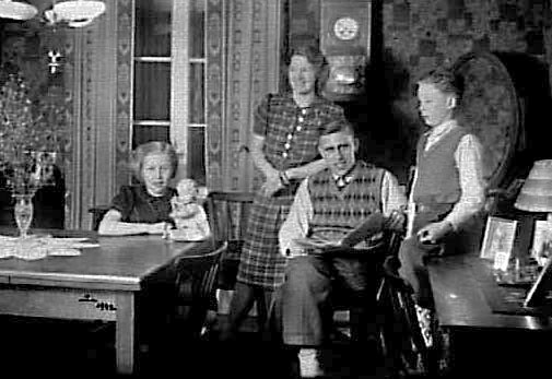 MOR OCH FAR MED TVÅ BARN SITTER I SITT FINRUM.