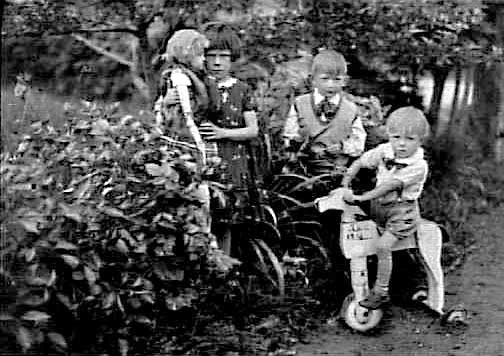 TRE BARN VARAV EN POJKE SITTER PÅ EN CYKELHÄST OCH EN FLICKA HAR EN DOCKA I FAMNEN