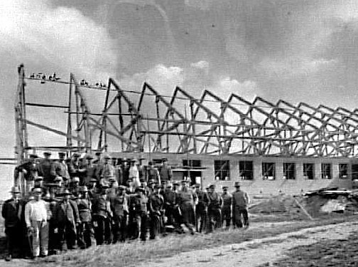 EN GRUPP MÄN SOM ARBETAR PÅ ETT LADUGÅRDSBYGGE.