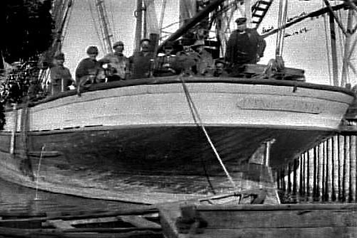EN GRUPP MÄNNISKOR SOM STÅR I FARTYGET DANIELS AKTER.