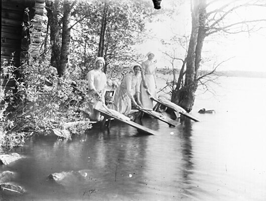 Grupporträtt, tre kvinnor som klappar tvätt i sjön.