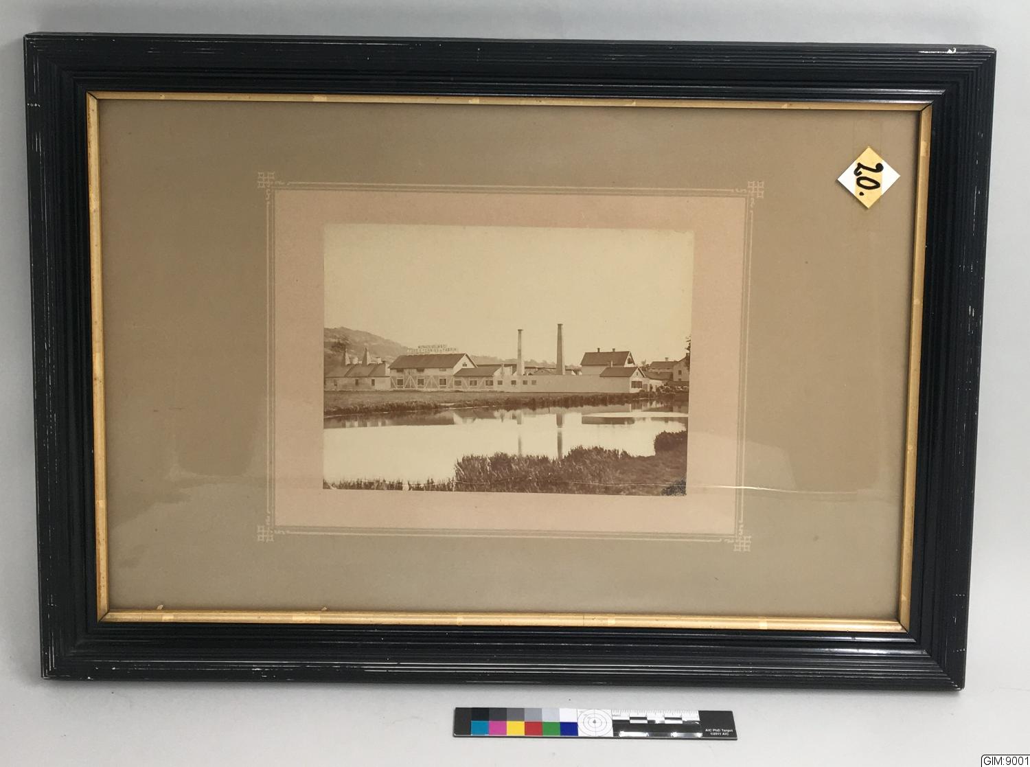 Fotografi före 1885, Drakes Tegelfarbik på Drakesgatan 1-3. På skyltet i fotografi står 'Werner Bolm & C, Färg & Ferniss fabrik'