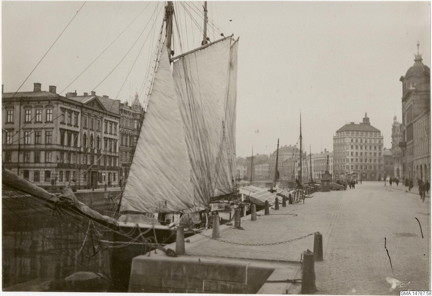 Sträckningsbild längs Södra Hamngatan och Stora Hamnkanalen, blick mot öster. Till höger syns Wijkska huset. Utsikt från Skeppsbroplatsen