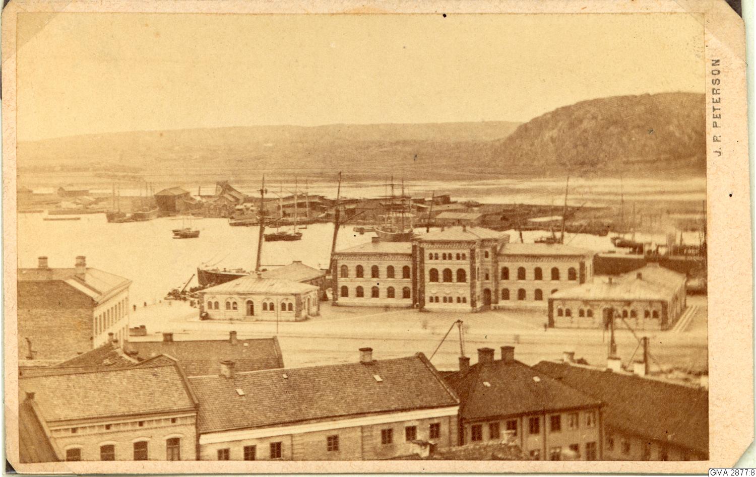 Utsikt från Kvarnberget över Packhusplatsen och hamnen. Till höger syns Ramberget.