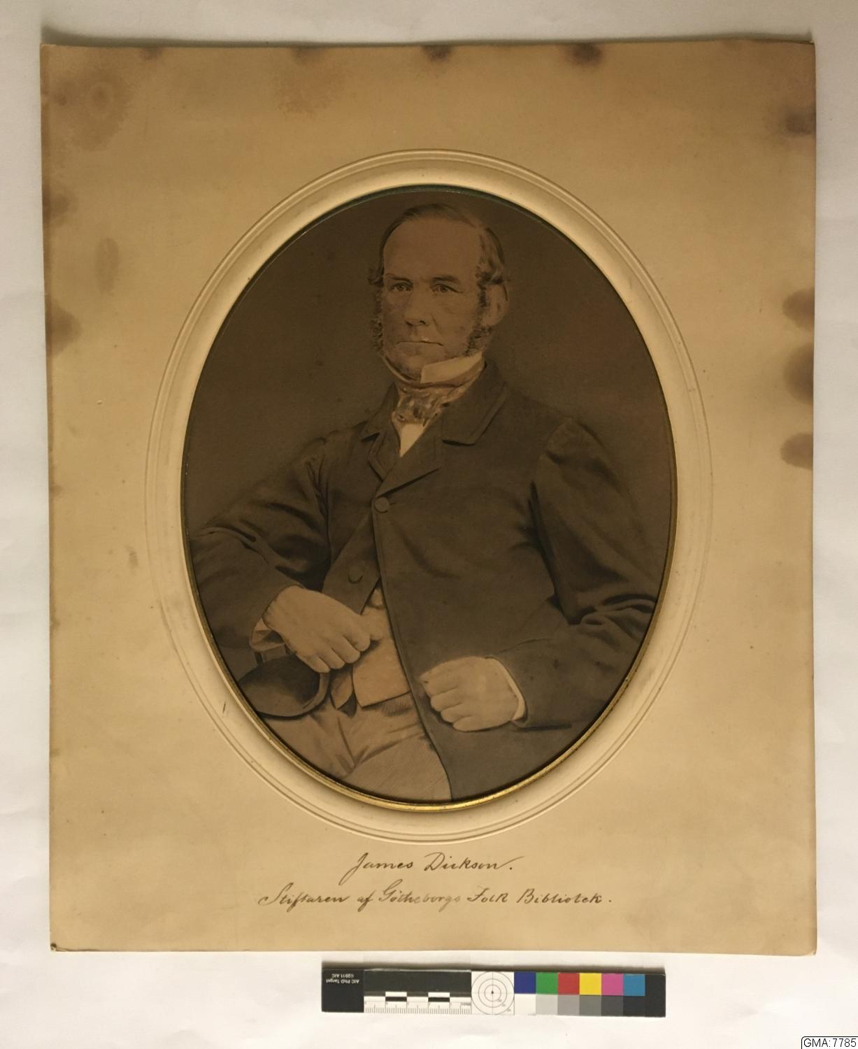 fotografi, porträtt av James Robertson Dickson (1810-1873). Kolorerat med akvarellfärger i sepiaton. Infällt i oval passepartout. Underskrift: "James Dickson. Stiftaren av Götheborgs Folk Bibliotek." Största inre mått: 28,5 cm.