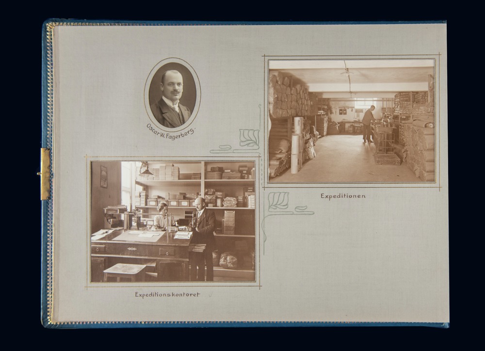 På uppslaget finns tre foto. Där är ett porträtt i bröstformat med oval inramning och namet under (Oscar W Fagerberg). Den ena större bilden har texten Expeditionskontoret. I förgrunden ett stort skrivbord och där står en kvinna och en man. I bakgrunden hyllor med papper, påsar och kartonger. Den andra bilden har texten expeditionen. Mitt i bild en öppen yta. Vid sidorna hyllor fullpackade med paket. En man står vid någon form av bord.
