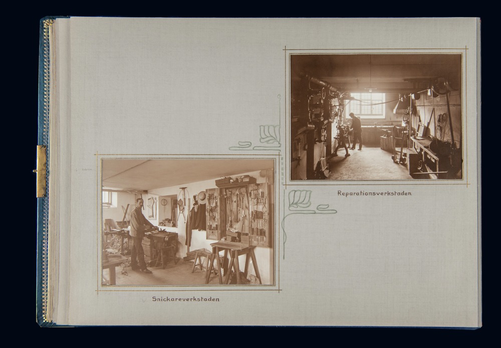 Där är två bilder på uppslaget. Bild ett föreställer snickarverkstaden. Där står en man vid en hyvelbänk, på väggen hänger verktyg, på golvet står olika bockar. Bild två föreställer reaprationsverkstaden. Där står en man vid någon maskin, svarv?, på väggen rörledningar. Där är också ett städ, en bänk och en säckakärra med mera.