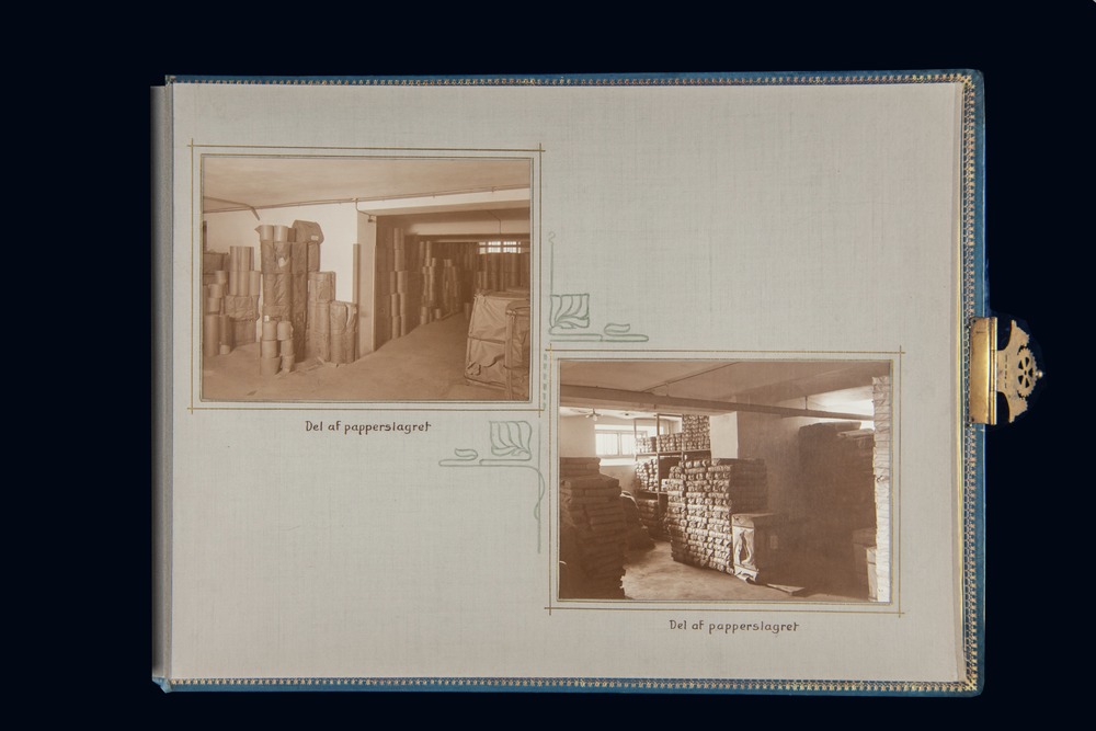 På uppslaget finns två bilder bägge med texten del af papperslagret. På den ena bilden syns rum med staplar med pappersrullar. På den andra bilden syns hyllor med paket och även på golvet ligger staplar med paket.