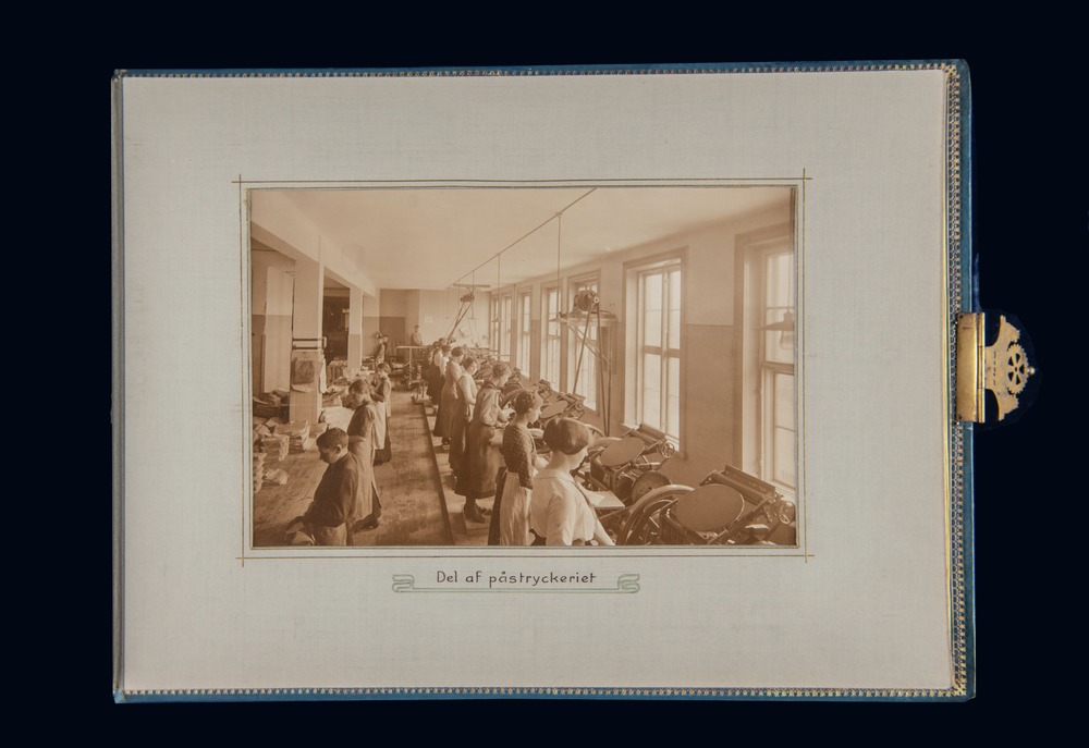 Bilden har texten del af påstryckeriet. Längs sidan mot fönsterna en rad med maskiner och en kvinna vid varje. Till vänster bord med påsar. Vid borden står arbetare.