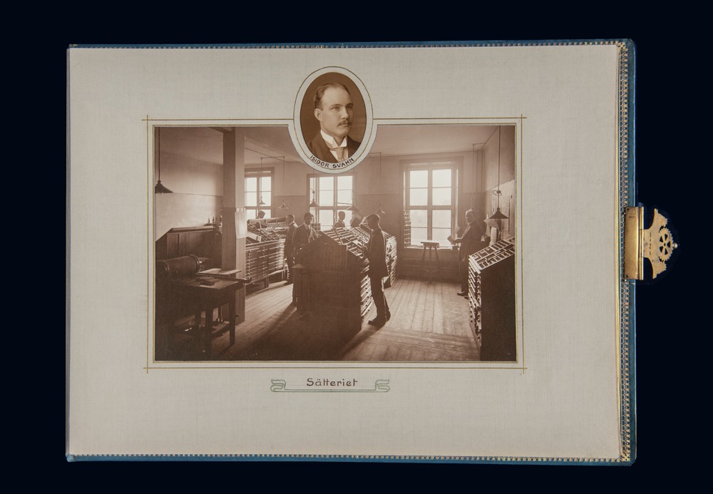 Två bilder på uppslaget. Ett porträtt i bröstformat med oval inramning och namnet textat under (Isidor Svahn). Den större bilden har texten Sätteriet. I lokalen bord och skåp samt ett antal män.