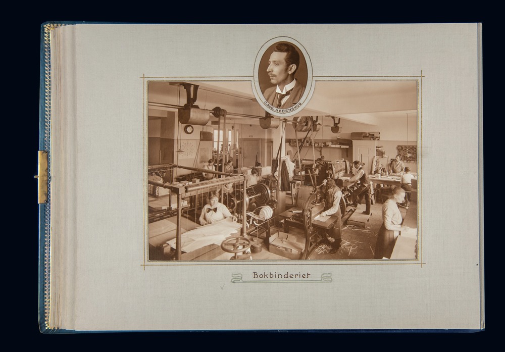 På uppslaget en interiör och en porträttbild ovalt inramad, bröstbild och namnet textat under (C Aug Hedenskog). Interiören föreställer bokbinderiet. Där finns flera olika maskiner och annan utrustning samt arbetande kvinnor och män.