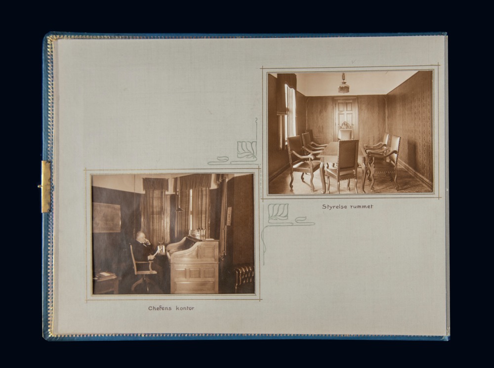 På uppslaget finns två bilder. Den ena med texten chefens kontor. Mitt i bild ett stort skrivbord vid vilket sitter en man och pratar i telefon. Gardiner framför fönsterna i bakgrunden. Den andra bilden har texten Styrelse rummet. Rummet har kala väggar och är möblerat med ett stort bord och sex stycken stolar med armstöd, karmstolar.