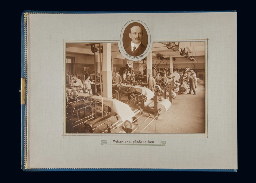 Två bilder på uppslaget. Ett porträtt i bröstformat med oval inramning och namnet textat under (Otto Lundström). UNder den stora bilden står det mekaniska påsfabriken. På bilden syns en rad med maskiner med papper på rulle i ena änden. Ett antal personer rör sig också i lokalen.