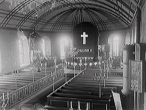 Interiörbild av Träslövs kyrka vid Oscar II:s död (8 december 1907), vilket framgår av altarets tillfälliga drapering. Notera kaminen till höger.