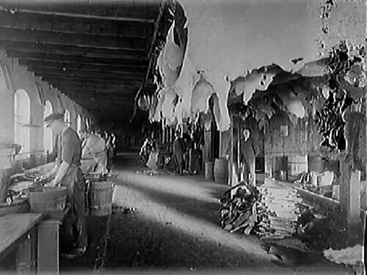 Garveriarbetare på rad vid en bänk i en långsmal industrihall där det hänger djurhudar på tork i taket.