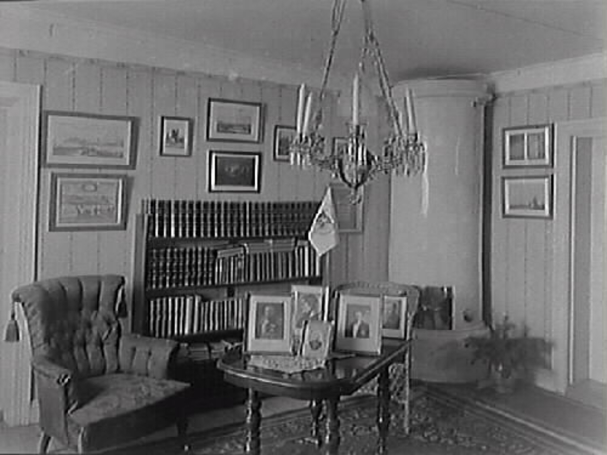 Interiör från vardagsrum med kakelugn och ljuskrona i taket.