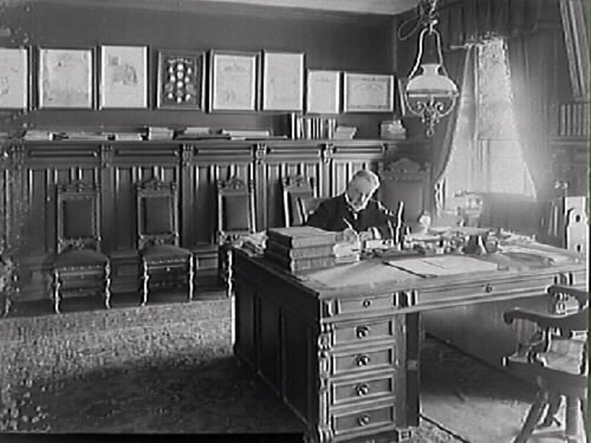 Interör från Varbergs sparbank: bankdirektörs- och styrelserum. En man arbetar vid skrivbordet.