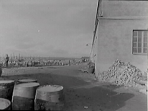Parti av Varbergs hamn. I förgrunden tunnor och till höger en putsad husgavel med småspröjsat fönster.