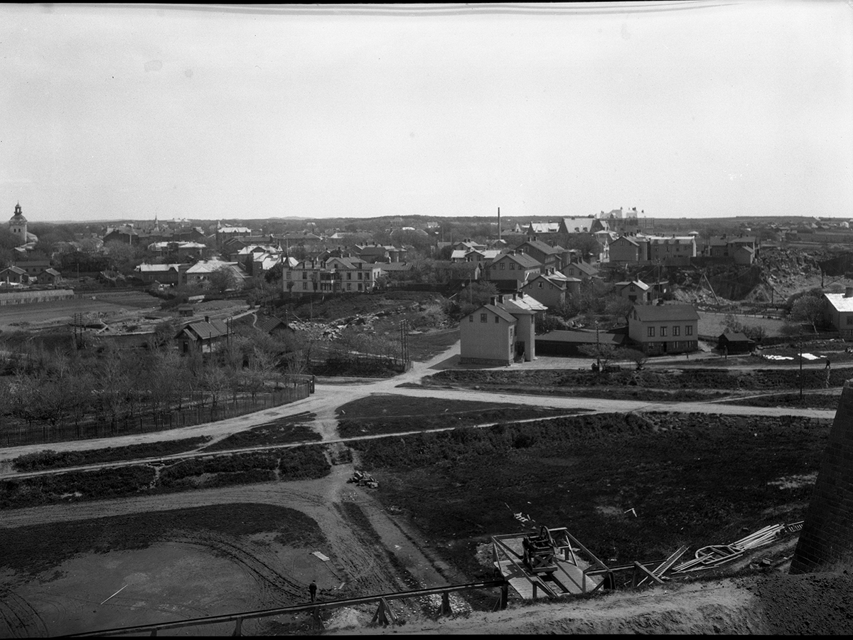 Vy från Varbergs fästning österut över Platsarna. I förgrunden ses den torrlagda vallgraven och ovan till vänster Varbergs kyrka. Fotografiet är taget efter 1920 eftersom järnvägen, som fram tills dess gick nedanför fästningen, inte är kvar.