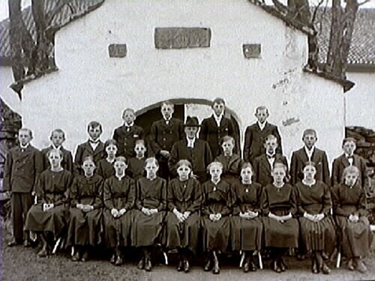 Prästen Nelsson (i mitten) med komfirmander utanför kyrkan. Komfirmanderna är klädda i mörka klänningar resp kostymer.