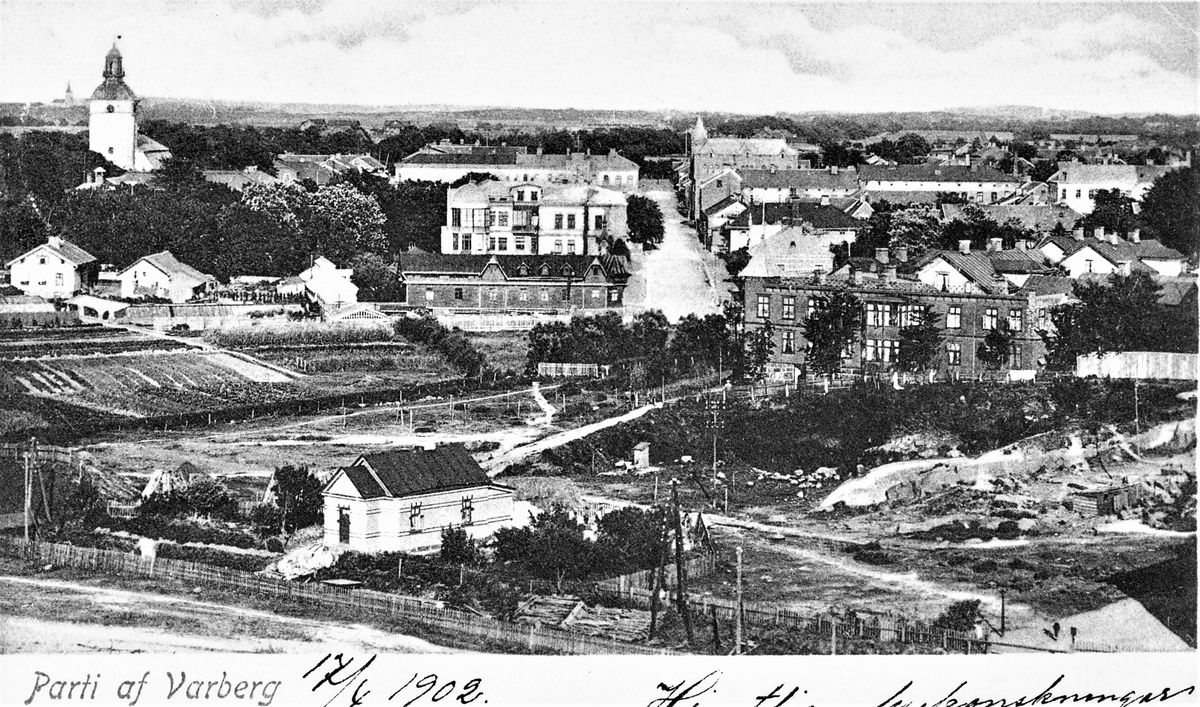 Brevkort, "Parti af Varberg", skrivet 1902. Motivet är en utsikt från fästningen mot staden i öster med del av Platsarna till höger i bild. Gerlachska huset och dess stallar syns mitt i bild på den breda Bäckgatans vänstra sida. Längre upp på gatans högra sida ses Sparbanken och som uppfördes 1898 - fotografiet måste således vara taget mellan 1898-1902. Vid horisonten ses Träslövs kyrka, till vänster om Varbergs kyrktorn. Jeppa Förstbergs handelsträdgård ligger till vänster i bild och byggnaden nedtill med vågräta fasadband är 'Freds' banvaktsstuga (Mellersta Hallands järnväg invigdes 1886) och den s k Tågängen.