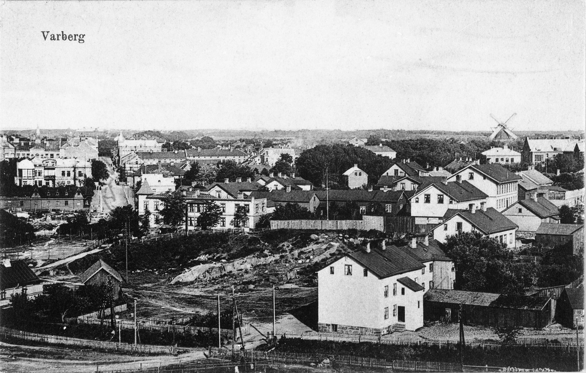 Utsikt från fästningen mot öster med del av Platsarna till höger i bild och i bakgrunden Agrells kvarn. I förgrunden går järnvägen söderut mot Falkenberg (ursprungligen Mellersta Hallands järnväg). Till vänster i bild syns Gerlachska huset och stallarna, med den breda Bäckgatan på högra sidan om fastigheten.