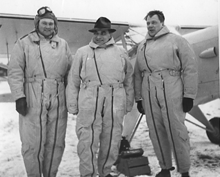 I mitten står Knut Olow och t v Tage Warborn iklädda overaller framför ett flygplan. (Warborn var son till Monark-grundaren Birger Svensson.)