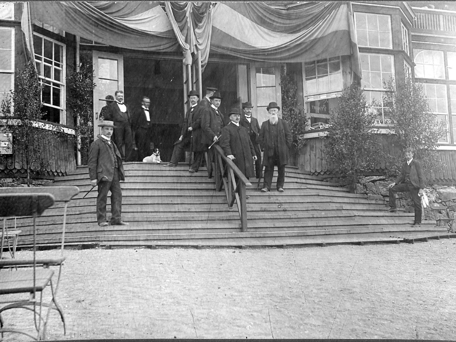 Högtidsklädda herrar och en hund i den lövade trappan till entrén av en stor byggnad (Societetshuset?). Över ingången ser sitter en stor, draperad textil.