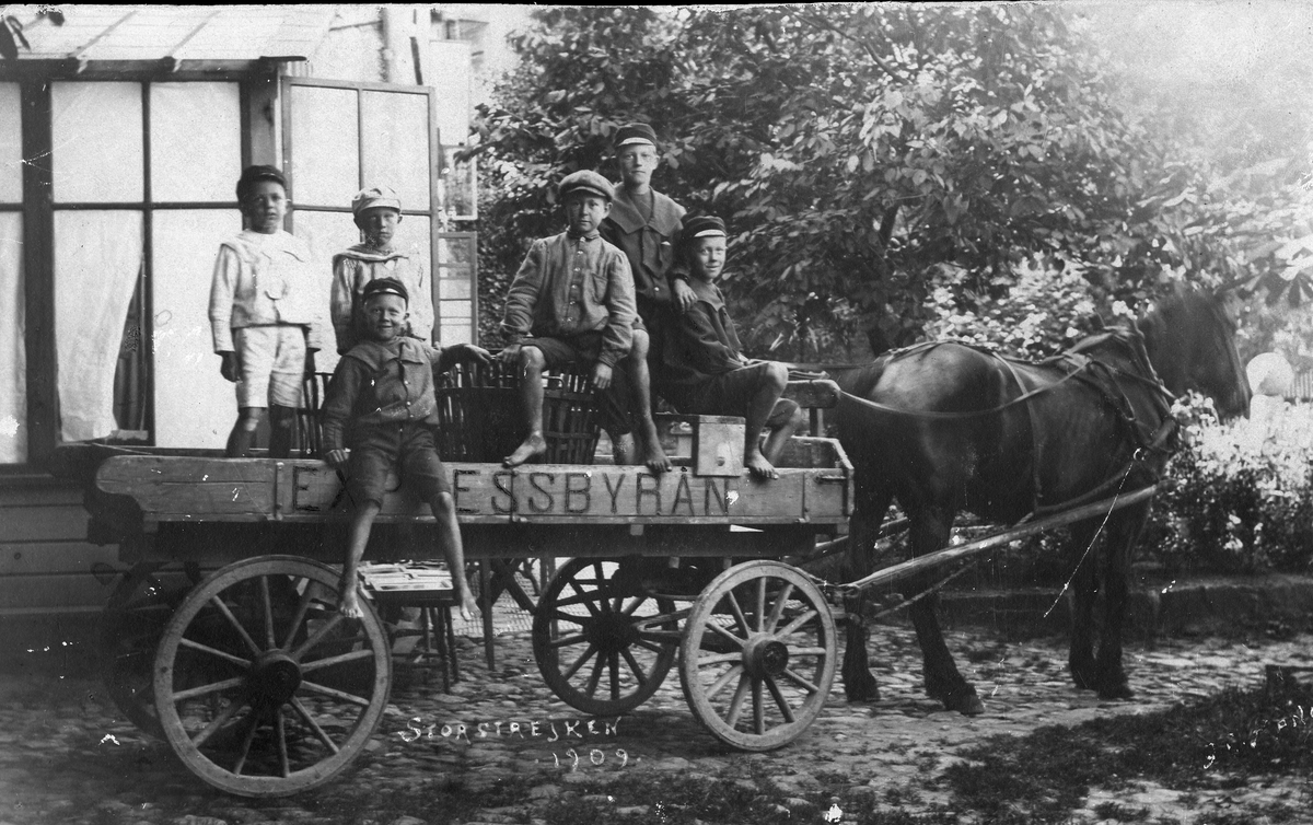 En hästdragen kärra från Expressbyrån står framför en byggnad med trädgård (troligen Ranchs ateljé). På flaket står och sitter sex pojkar som är barfota och har vegamössor. Kärran har järnskodda trähjul och ekipaget står på kullersten.