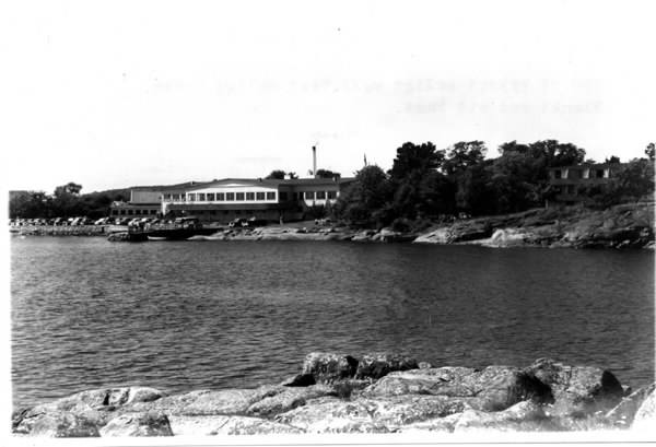 Vykort, "Restaurangen, Gottskär". Restaurang är fotograferad från Utholmen, dit en bro leder ur bild till höger. Framför restaurangen skjuter den gamla ångbåtsbryggan ut i vattnet.