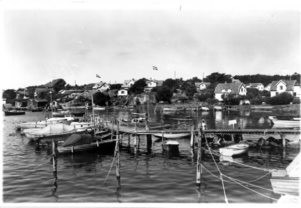 Vykort, Småbåtshamnen i Gottskär med bryggor, motorbåtar och roddbåtar. Villorna ligger tätt i den kuperade terrängen i bakgrunden, där några flaggor vajar i vinden.
