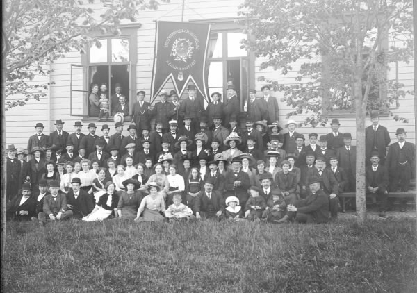 Gruppbild av medlemmar i IOGT Varberg (se bild GB2_981). En stor skara människor, även små barn, formerade vid fasaden till ett hus, sannolikt deras föreningslokal. I de öppna fönstren står också personer.