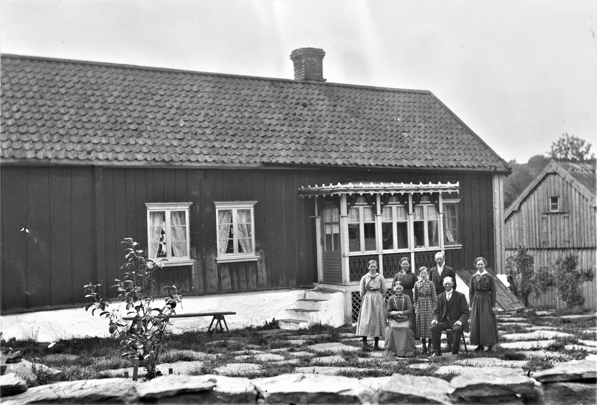 Sällstorp 6, gården kallas "Bernts". Anna-Kristina och Aron Johansson sitter vid manhusbyggnadens veranda. Bakom dem står från vänster barnen Emelia, Berta, Edit, Johan och Klara. Gårdsytan täcks av stora stenhallar och vid stengärdsgården står ett ungt träd. Verandan är dekorerad med intrikat snickarglädje, särskilt runt takfoten. I bakgrunden skymtar en omålad ekonomibyggnad.