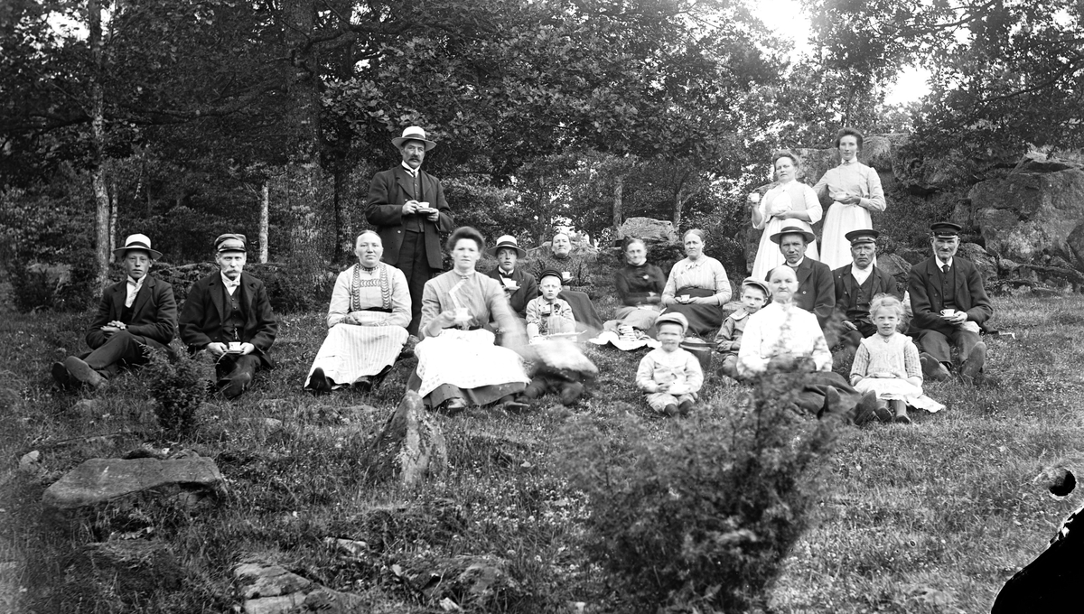 Sällstorpsbor ur olika generationer på Ahlbergs kulle, strax ovanför Mege-Olivias stuga. Mannen som står heter August Börjesson. De sitter i en gräsbacke med kaffekoppar i händerna.