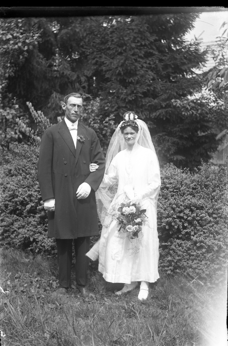 Ett brudpar står ute i en grässlänt. Bruden har myrtenkrona och brudgummen en liten myrtenkrans på rockslaget. Båda bär vita handskar.