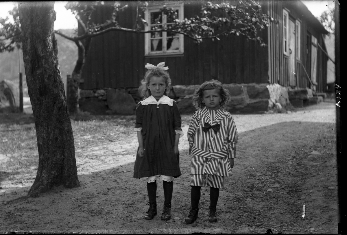 Två små finklädda barn vid ett träd intill en gårdsbyggnad. Pojken är klädd i kortbyxor och kolt med sjömanskrage av samma randiga tyg. Flickan har en mörk klänning med vita spetsar på krage, ärmar och nedtill. Hon bär rosett i håret och han på kolten.
