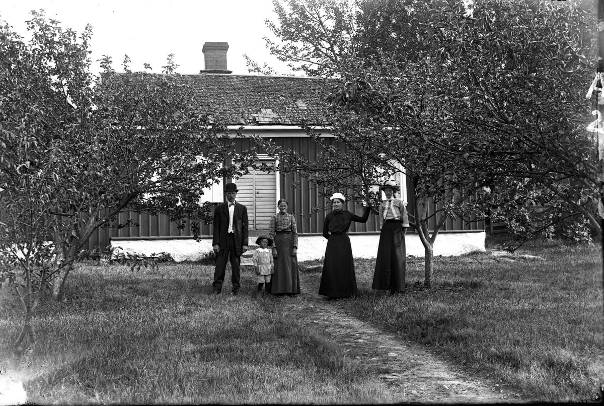 Fyra vuxna och ett litet barn står söndagsklädda i trädgården framför en stuga. Alla bär huvudbonader utom den äldsta kvinnan. En stig i gräsmattan, med äppleträd på båda sidor, leder fram till stugdörren. Den är ålderdomlig med två smala dörrblad och endast ett nyckelhål, inget vred. Husgrunden är vitkalkad och sticktaket (pärt) har lappats med stickor av större storlek än övriga.