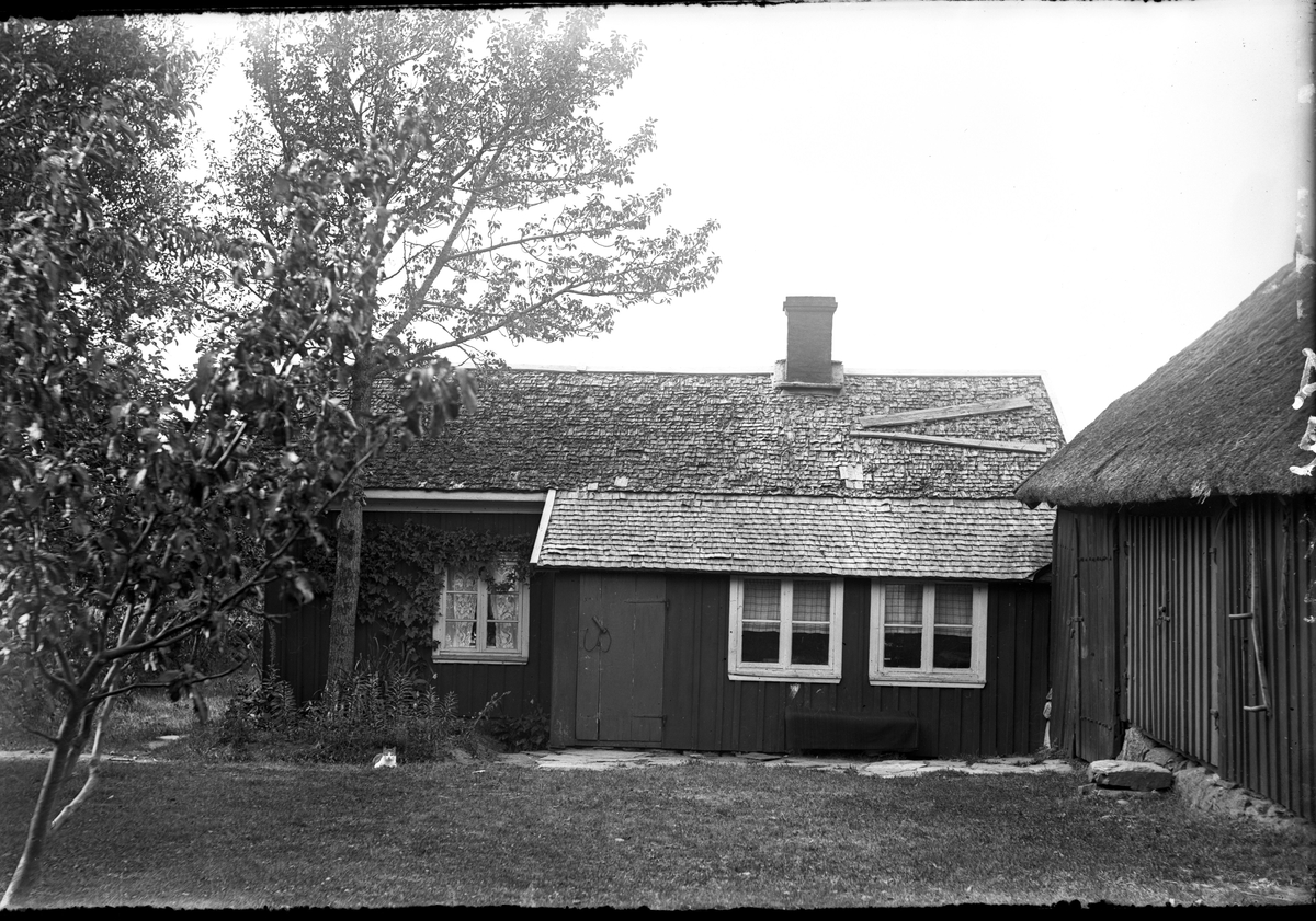 Stuga i vinkel med ladugården. Huset har en smal och låg tillbyggnad åt gården med ingång och två fönster. En katt ligger vid trädrabatten med liljor till höger i bild, och fönstret bakom kläs in av en klätterväxt på fasaden. Uthusets dörrar är försedda med hänglås och en lie är upphängd på ytterväggen.