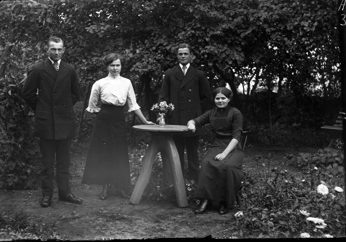 Torpa, Mossagården, från vänster ses Albert, Sigrid, Natanael och Jenny Eklöw. De är samlade kring ett bord i trädgården, omgivna av blomster.
