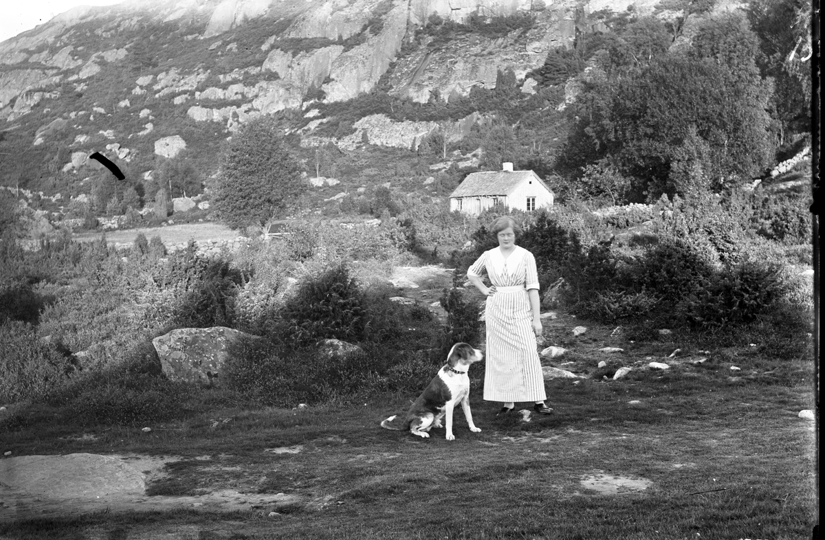 En kvinna står med en stor hund i naturen. I bakgrunden reser sig en hög bergvägg och ett hus ligger rakt bakom kvinnan.