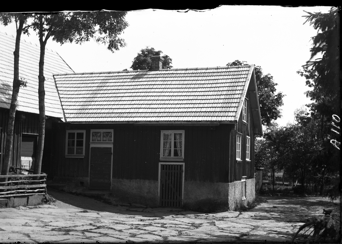 Göras i Vallby, Veddige. Bostadrum i en utbyggnad från ladugården. Taken är möjligen nylagda med flacktegel. Gården är stenlagd och nere till höger i bild står en cykel parkerad.