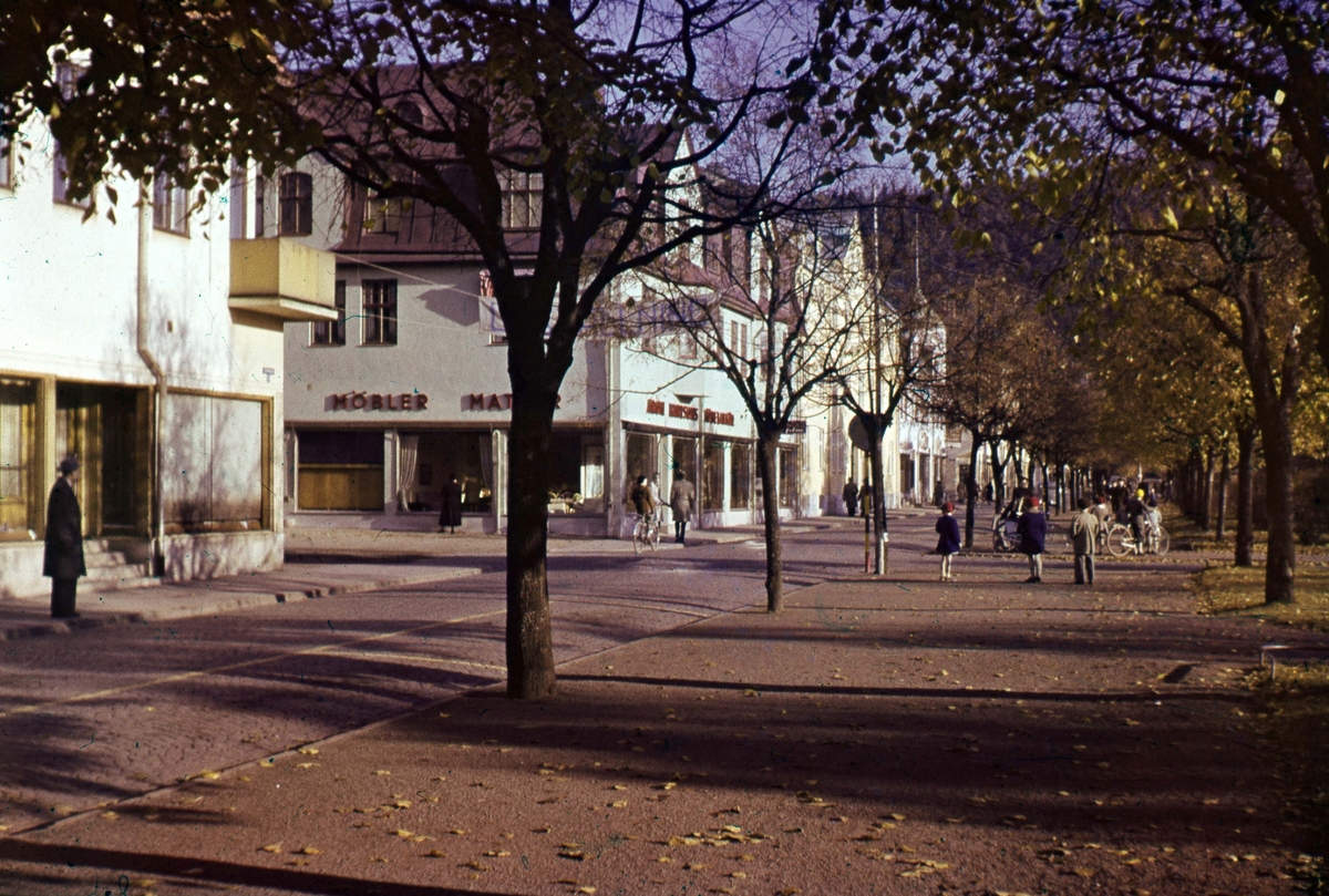 På ett husets fasad, korsningen Erik Dahlbergsgatan och Tegnérgatan, kan man läsa Möbler Mattor. Året är 1963.