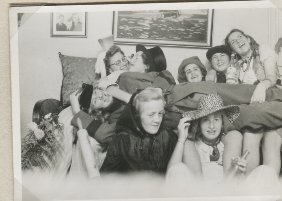 Möhippa för Ingegärd Magnusson (1927-2007) i Apelgården "Efraims" cirka 1950/51. Ingegärd sitter längst fram i mitten.