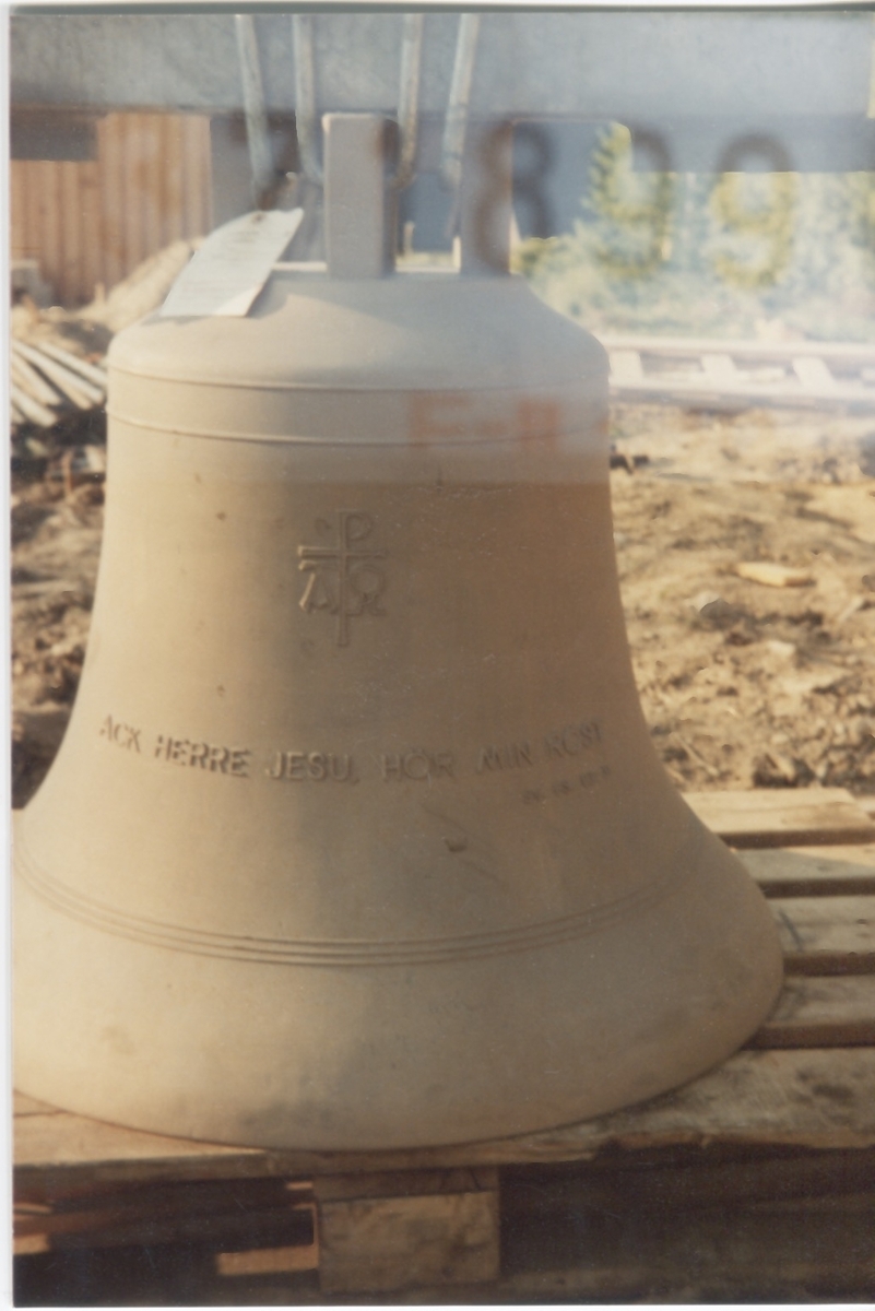Apelgårdens kyrka 1981 eller 1982. Kyrkklocka skänkt av Dagny och Bo Risberg, Hultet.