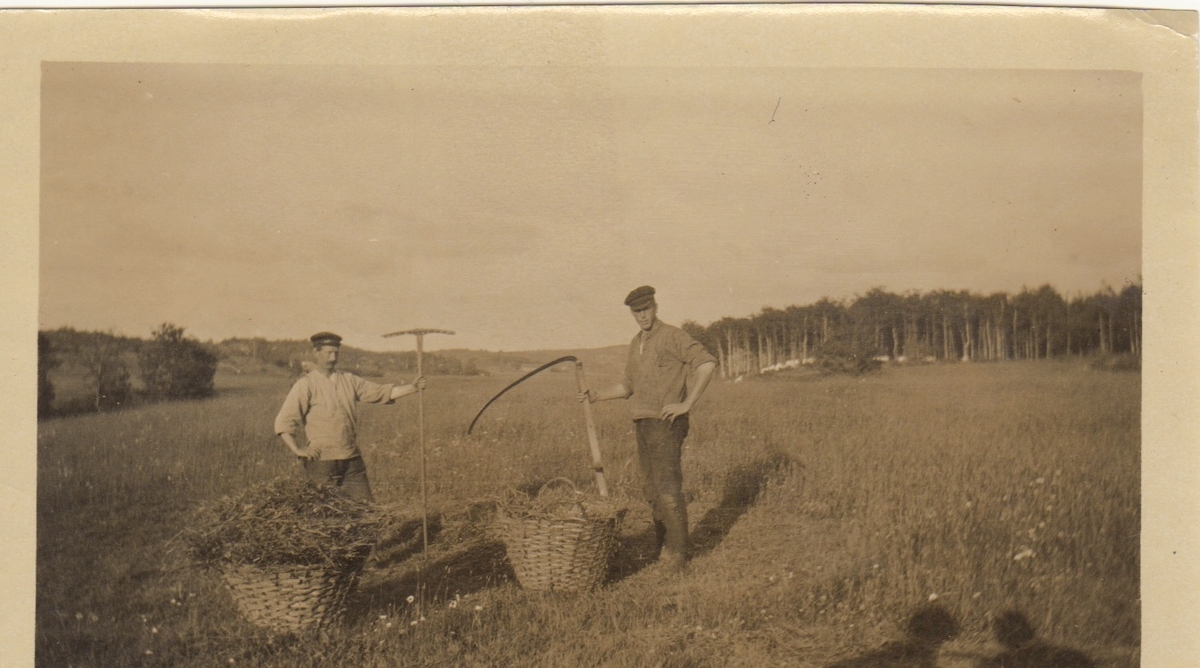 Två män står på ängarna vid Labacka 1:2 "Lund" okänt årtal. Till höger står Axel Johansson (1895-1974) med en lie.