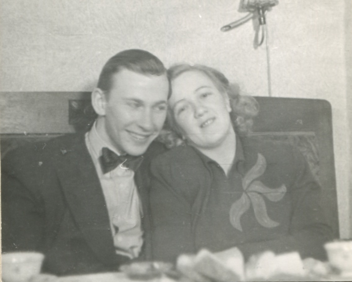 Paret Knut Johansson (1924-1984 i Lindome) och Ingegärd Magnusson (född 1927 i Stockholm, död 2007 Apelgården, Kållered) sitter i en soffa i Apelgården "Efraims" okänt årtal. Paret gifte sig 1951. Ingegärd var fosterdotter till Selma och Efraim Magnusson, Apelgården.