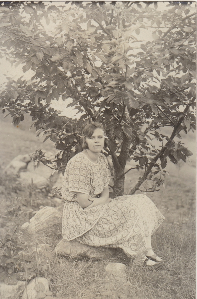 Olga Olsson (1907-1997, gift Andersson) sitter vid ett träd, Labacka 1:2 "Lund" okänt årtal. Syster till Lisa (Elise) Johansson (1898-1997) som bodde på gården.