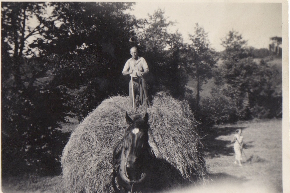 Höbärgning med hjälp av häst, Labacka 1:2 "Lund" okänt årtal. Axel Johansson (1895-1974) står på hölasset. Okänd kvinna till höger.