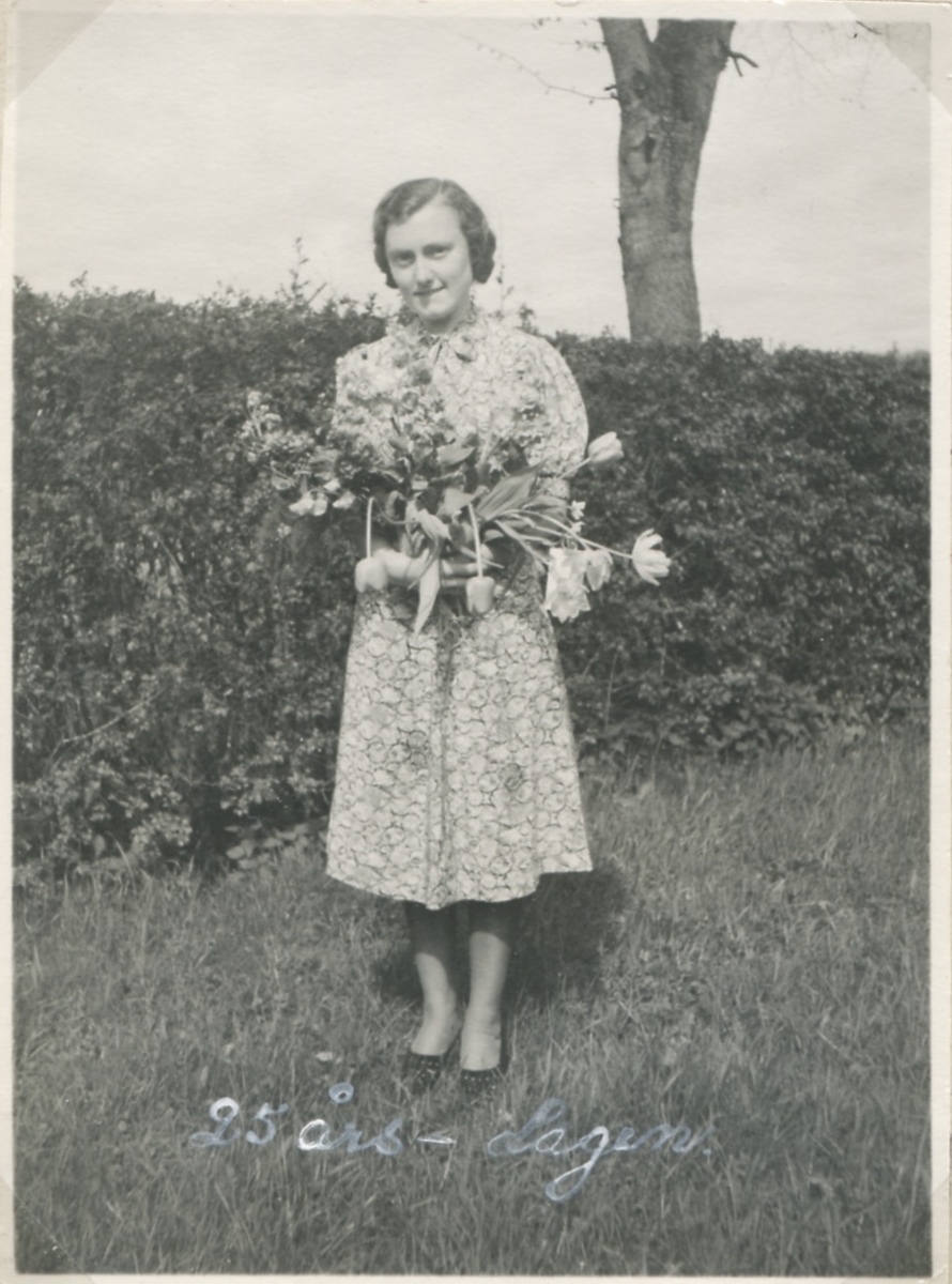 Lisa Eriksson (1917-2006, gift Jakobsson) uppvaktas på 25-årsdagen, Heljered Mellangård "Store Börjes" år 1942. Dotter till Tekla och Axel Eriksson.
