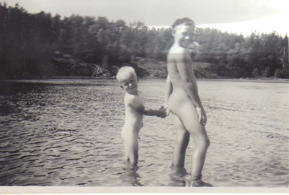 Två nakna pojkar står i Tutjärn, Labacka i Kållered 1930-tal. Från vänster: Bengt Johansson (1930-2016), Labacka 1:2 "Lund och kusinen Sven Erik Lindegren.